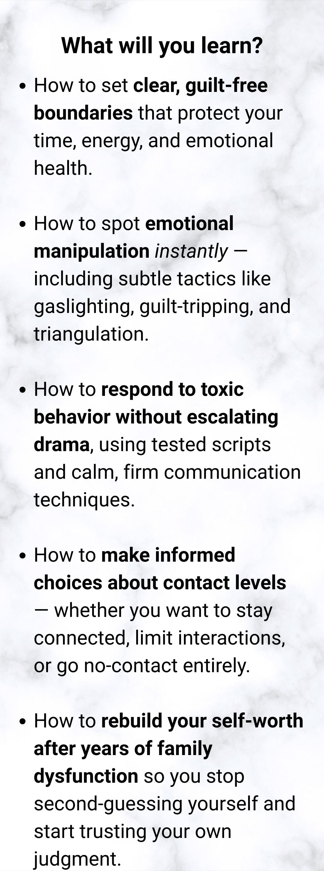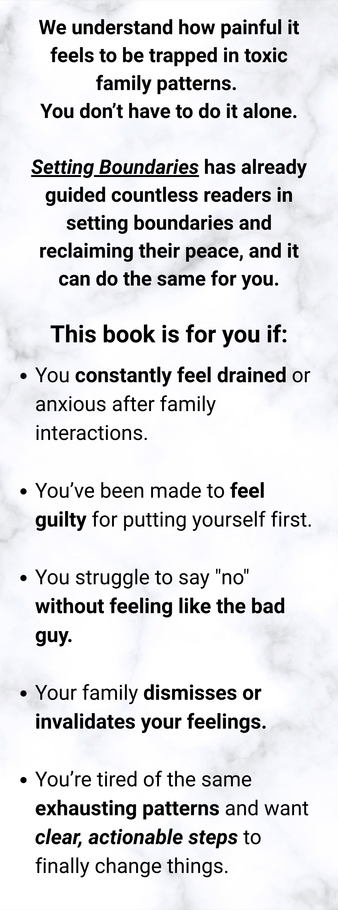 If this book doesn’t give you the clarity, confidence, and tools you need to start breaking free from toxic family patterns, simply email us within 7 days of purchase and we’ll refund 100% of your money — no questions asked.